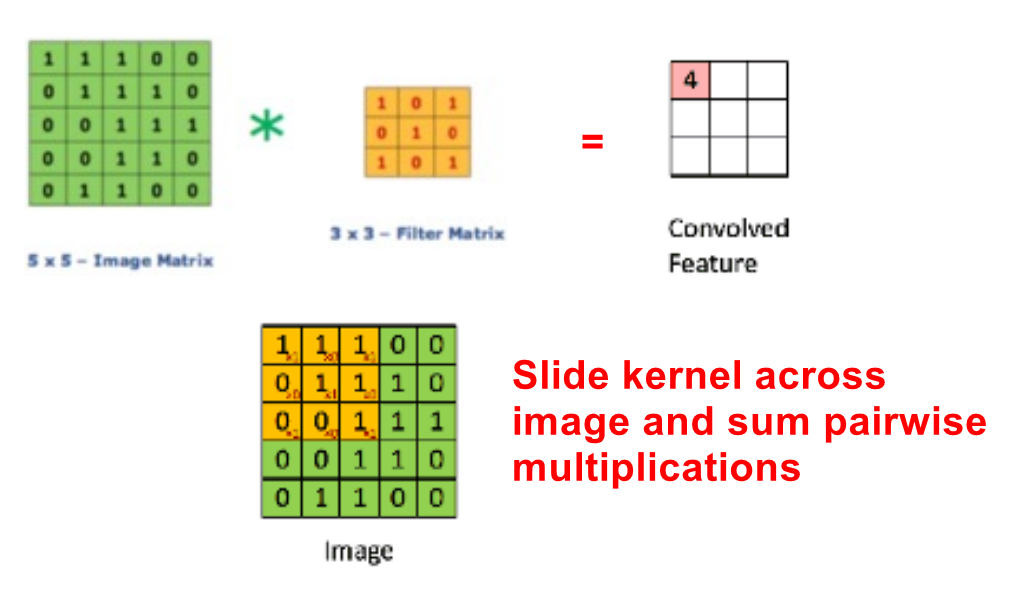 Slide a filter (kernel) over the input data matrix, applying element-wise multiplication, and sum the results to create a new output matrix.