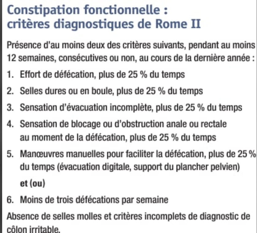 Nommez les critères Dx de Rome pour constipation:
