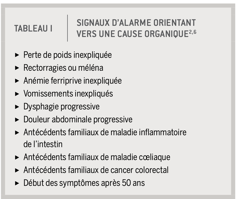 Quels sont les signaux d’alarme pour un patient chez qui on suspecte un SCI et qui nous orienterait vers une cause organique?