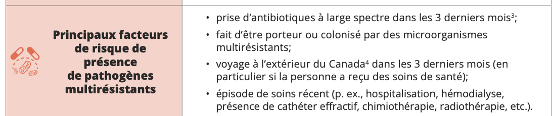 Nommer les facteurs de risque de la présence de pathogènes multirésistants? (diverticulite et autres infections abdo)