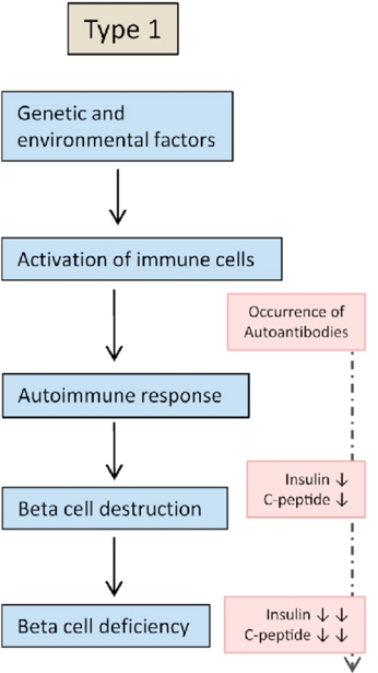 Results from T-cell immune-mediated destruction of insulin-producing pancreatic islet cells over months to years → complete lack of insulin