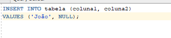 INSERT INTO tabela (coluna1, coluna2) VALUES (‘João’, NULL);