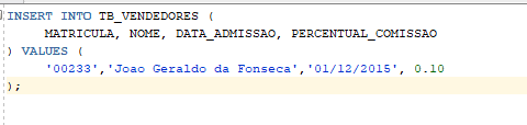 Durante a sua rotina de trabalho, Fátima recebeu uma demanda de cadastrar diretamente na tabela TB_VENDEDORES no banco de dados.
