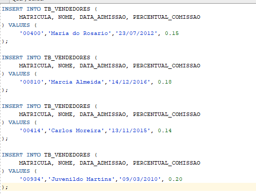 André, integrante da equipe de Fátima também recebeu uma demanda para cadastrar 4 pessoas vendedoras utilizando SQL. Como seria esse código de cadastro?