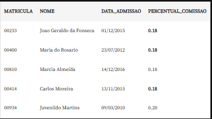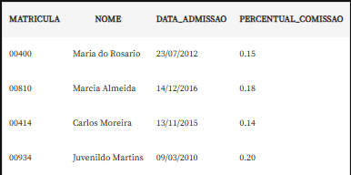 MATRICULA, NOME, DATA_ADMISSAO, PERCENTUAL_COMISSAO