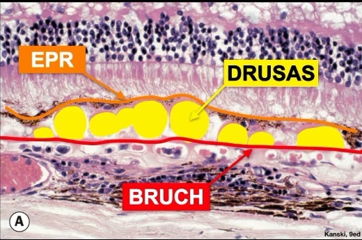 Os depósitos de materias entre o EPR e a Membrana de Bruch (drusas) criam uma barreira que dificultam a as trocas realizadas entre coriocapilar, EPR e Fotorreceptores e gera sofrimento do EPR. A falta de Fatores Tróficos produzidos pelo EPR lesam a coriocapilar, que deixa de nutrir os fotorreceptores, gerando atrofia local.