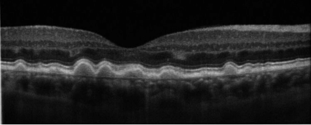 Elevações da Linha do EPR, separando-a de outra linha hiperrefletiva: a Membrana de Bruch