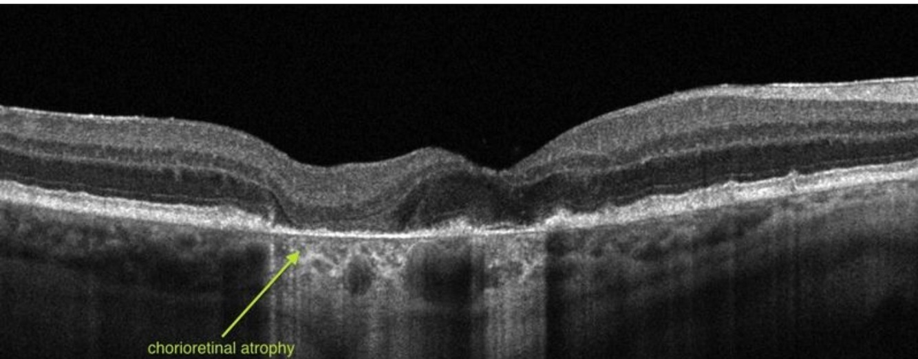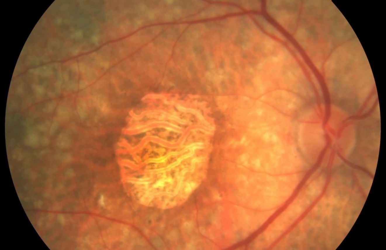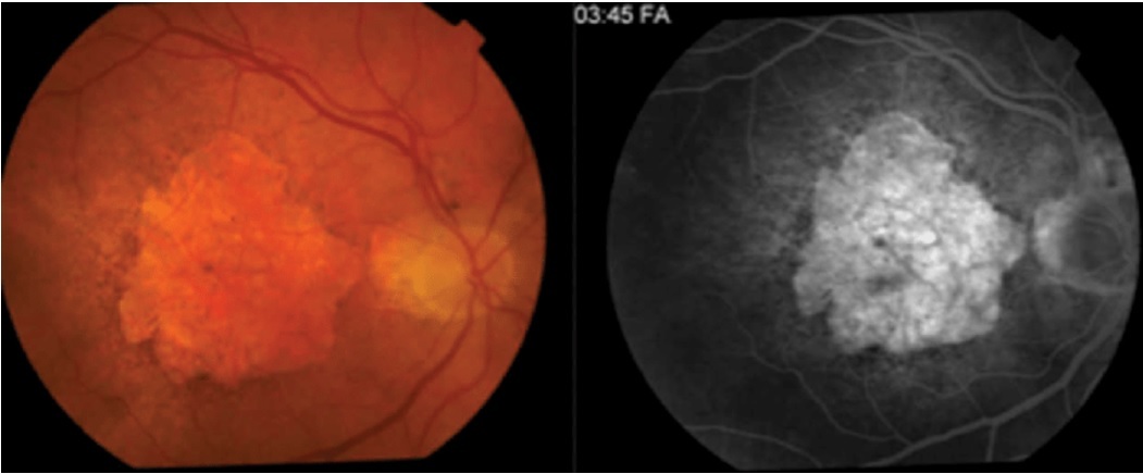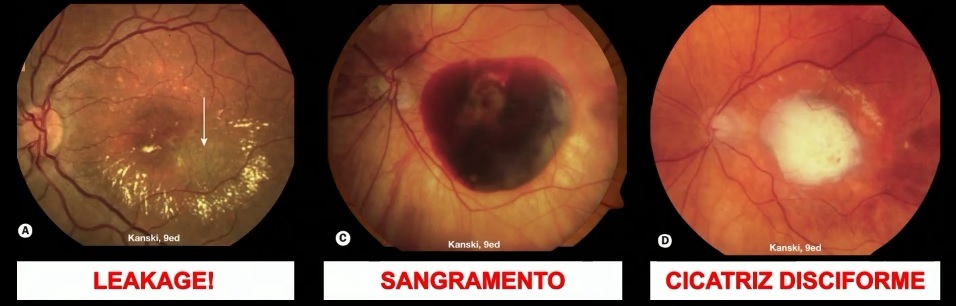 A presença concomitante de fibroblastos, pode levar a fibrose local, após regressão deses vasos, formando uma área extensa de fibrose sub-retiniana conhedida cono Cicatriz Disciforme.