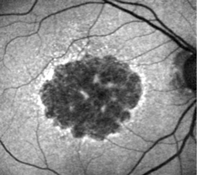 Quais são os achados típicos da Atrofia Geográfia da DMRI, na Autofluorescência?