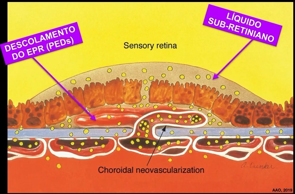 Esses Neovasos são incompetentes, extravasam parte de seu conteúdo, gerando DEPs, Líquido sub-retiniano, e sangramentos.