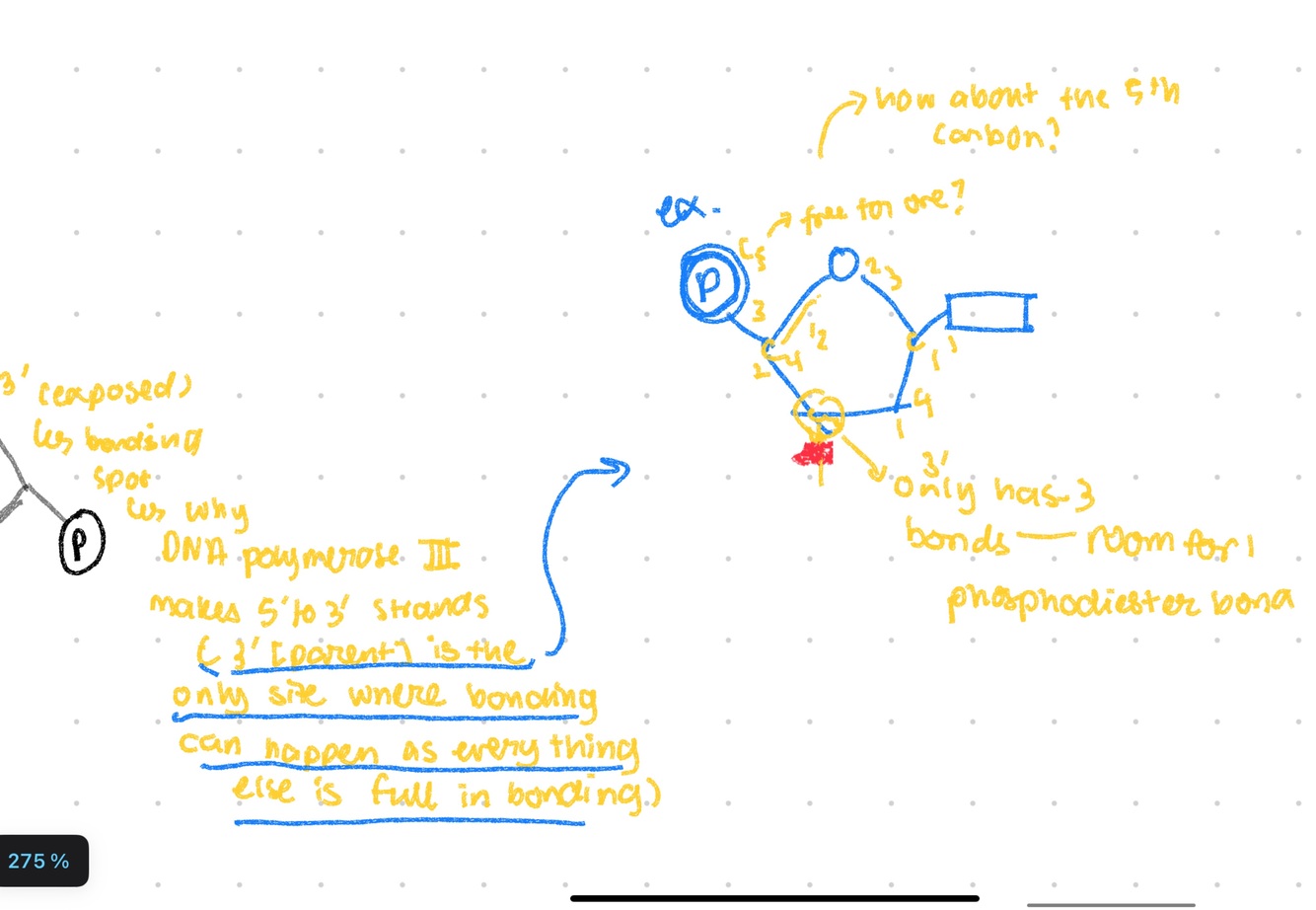 Why is the 3’ carbon the ONLY available carbon for bonding in DNA?