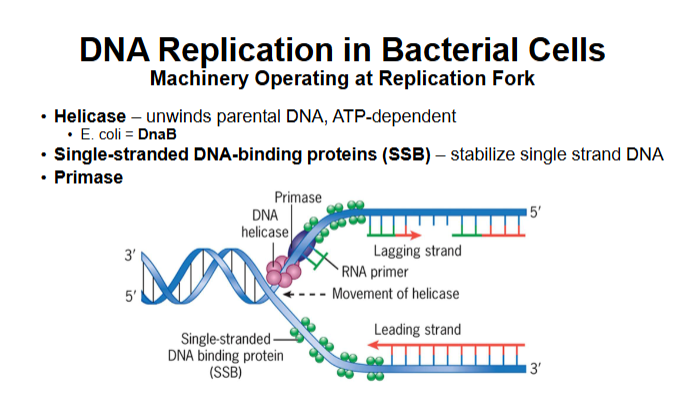 What are the enzymes involved at the replication fork
