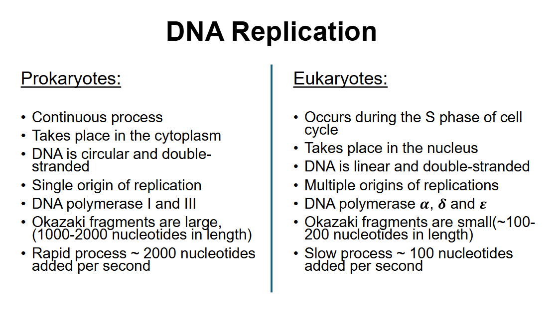 Differentiate prokaryotic vs eukaryotic DNA replication