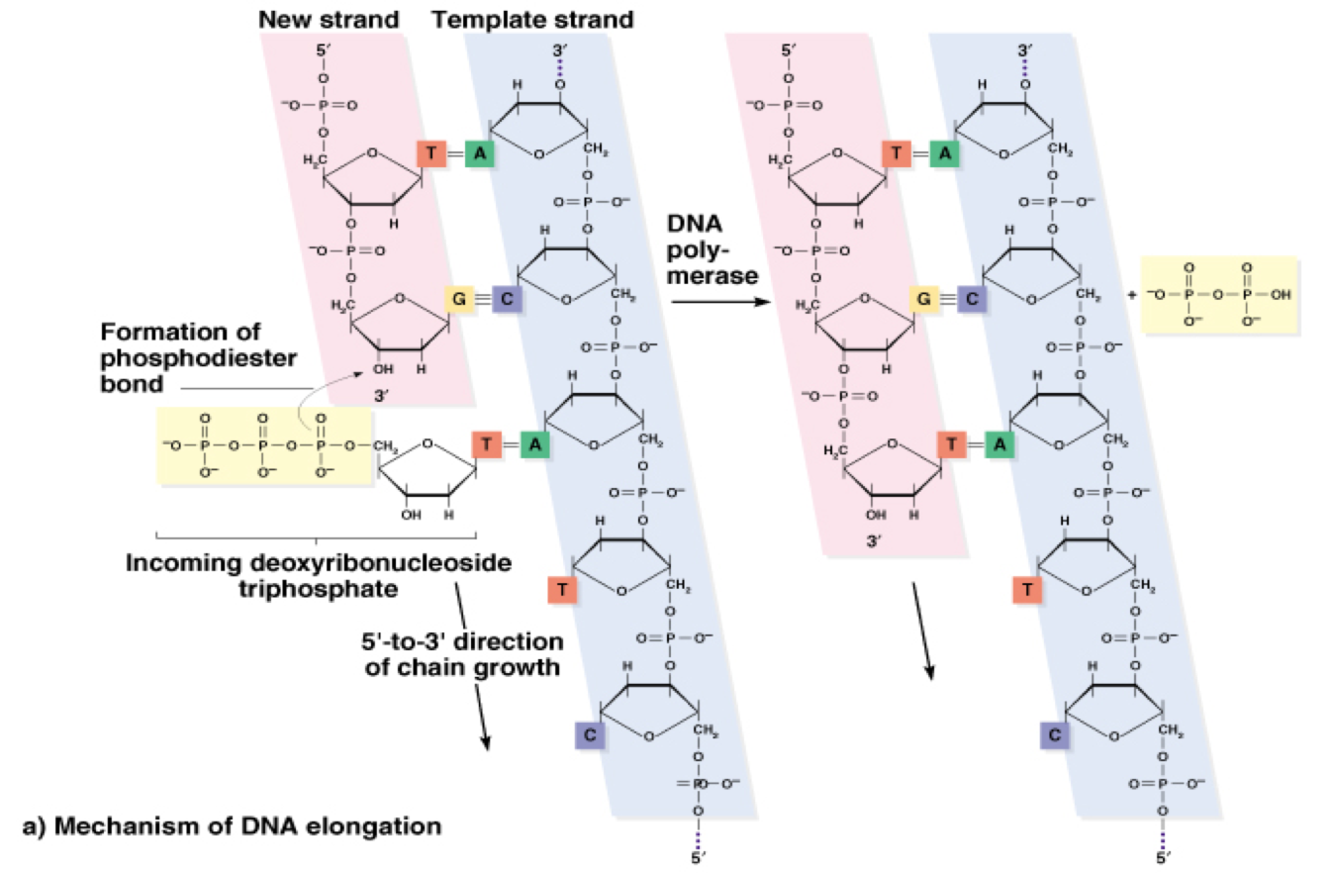 → DNA polymer w/ phosphodiester bonds + PPi