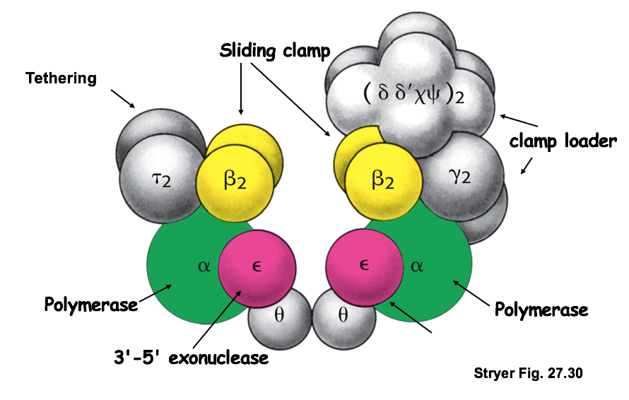 DNA pol III dimer binds w/ β subunits (sliding clamp) to leading strand, w/ γ subunits (clamp loader) to lagging strand