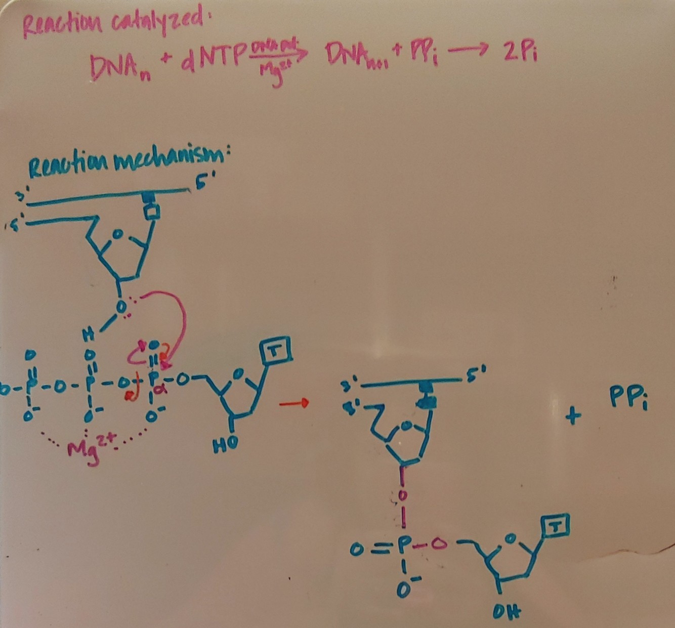 The mechanism of DNA replication involves a ____________________ attack by the 3’ hydroxyl on the alpha phosphate of the incoming dNTP. The reaction catalyzed is called a ____________________ as it synthesizes DNA based on complementary base pairing to a template DNA strand. DNA polymerase requires two ___ ions in the active site.