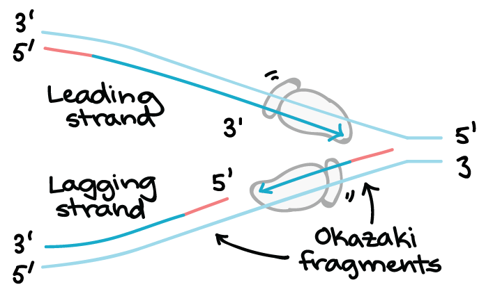 You must be able to identify the direction of replication, the lagging strand, and the leading strand at a replication fork.