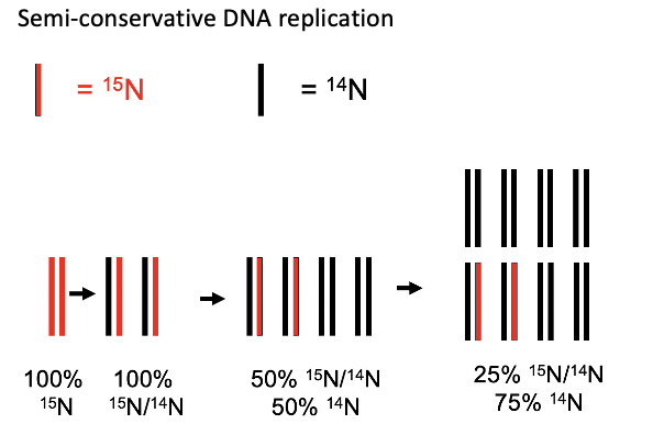 Semi-conservative replication (as demonstrated by Meselson and Stahl)