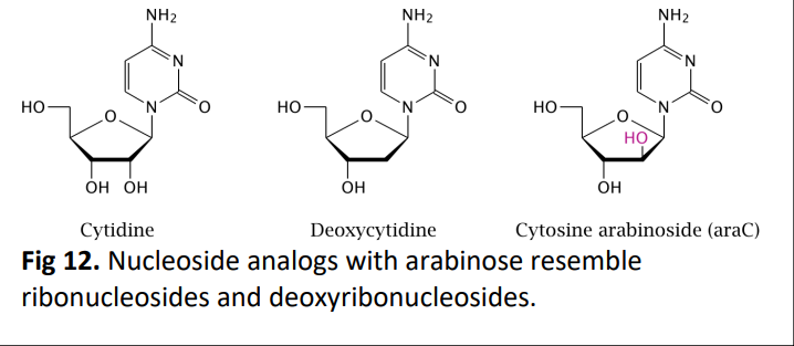 o Cytosine arabinoside (cytarabine, araC) resembles cytidine but has