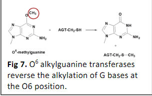 O 6-alkylguanine transferase (AGT) directly reverses alkylation at O 6 of guanine. AGT transfers the O6-alkyl group to a Cys residue in the AGT active site (Fig 7). The AGT protein is inactivated by the alkylation and degraded.