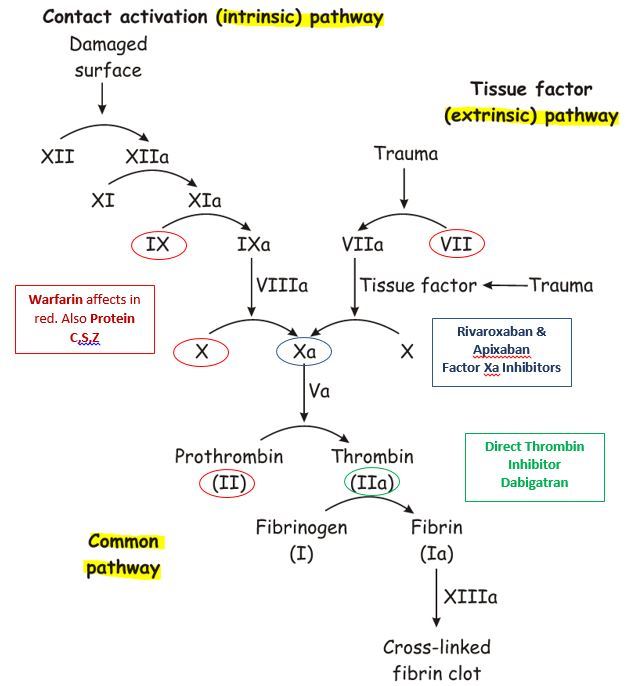 Describe the coagulation cascade & where oral anticoagulants fit in it?