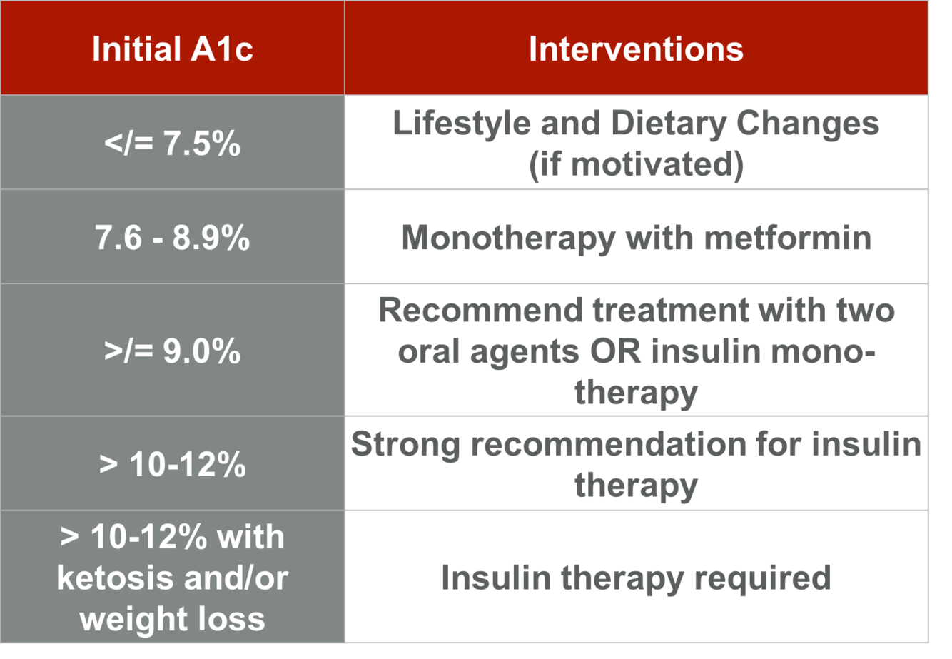describe the treatment options for varying levels of initial A1c