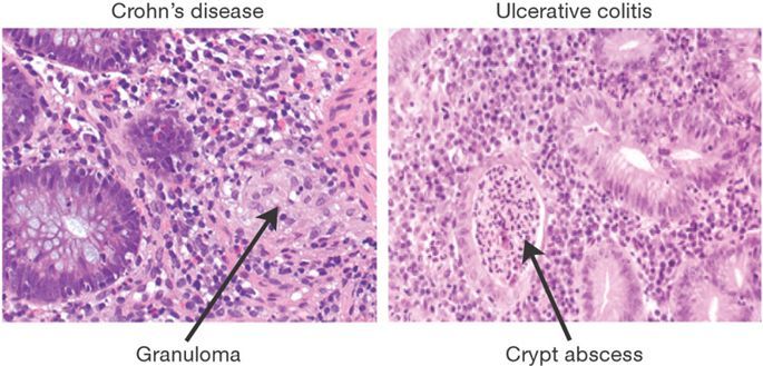Qual achado da bióspia da RCU e da DOENÇA DE CROHN?