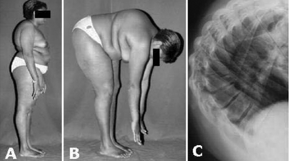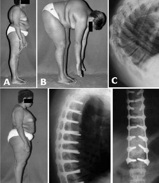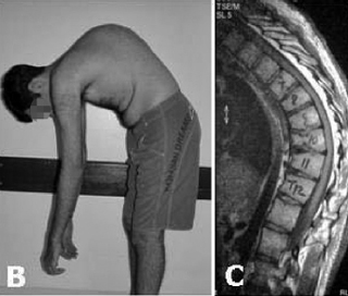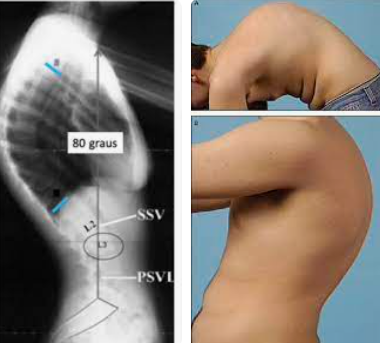 Os sinais incluem cifose angular torácica ou toracolombar, hiperlordose lombar compensatória, músculos encurtados e, em cerca de 30% dos casos, escoliose.