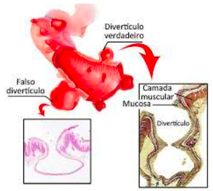 Pseudodivertículo/Falso divertículo: protrusão da mucosa e submucosa através das camadas do músculo