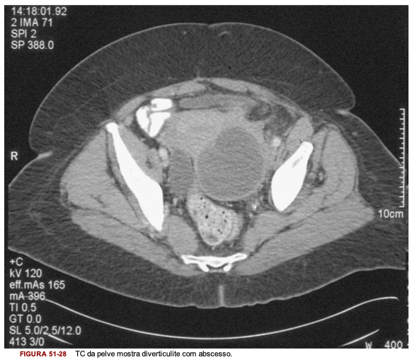 TC da pelve mostra diverticulite com abscesso