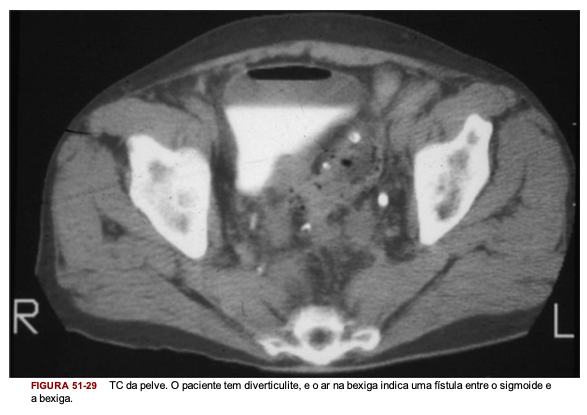 TC do abdome e pelve: mostra localização, extensão e gravidade da doença; além disso mostra alterações patológicas fora do cólon como um abscesso ou fístula colovesical