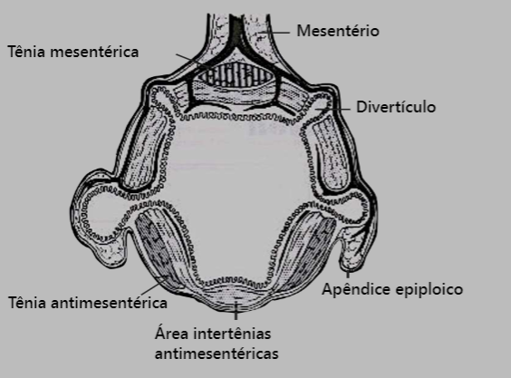 O cólon tem 3 tenias. 1 mesentérica, escondida na gordura mesentérica e 2 antimesentéricas ( que a gente ve). A borda mesentérica é a mais perto do mesentério