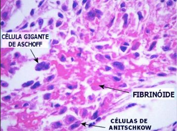 inflamação intersticial difusa, presença dos nódulos de Aschoff e necrose fibrinóide