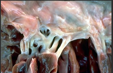 Cardite reumática crônica: Observar valvas com nódulos brancos, cordoalhas espessadas, brancas e encurtadas