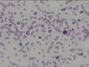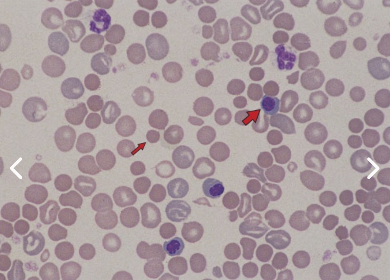 The larger arrow is pointing to a nucleated red blood. These are immature erythrocytes that have been released early from the bone marrow in response to the dog’s anemia and increased need for oxygen carrying capacity.