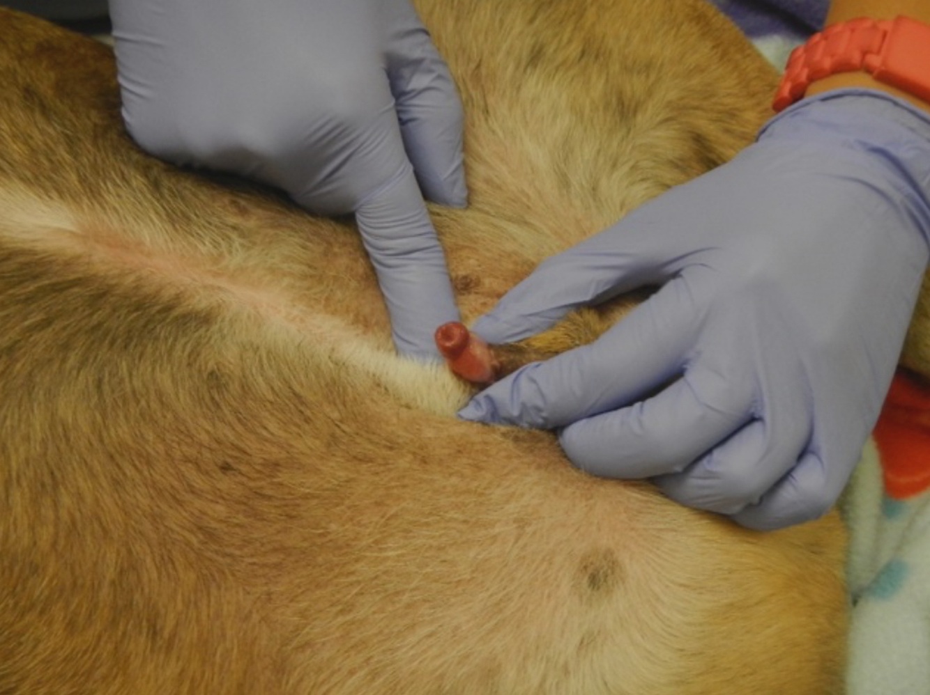 A 12-year-old male intact English bulldog presents to your hospital for a drop of blood noted coming from the penis. The dog has no other prior medical history. On examination, both testicles are descended and palpate normal in size. A rectal exam reveals a large, but symmetrical prostate gland. You extrude the penis and note what is illustrated in the image below. What is your recommendation to the owner?