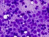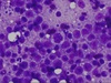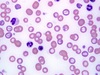 These cells are typically larger than a mature erythrocyte, have a very dark purple nucleus, and have basophilic cytoplasm.