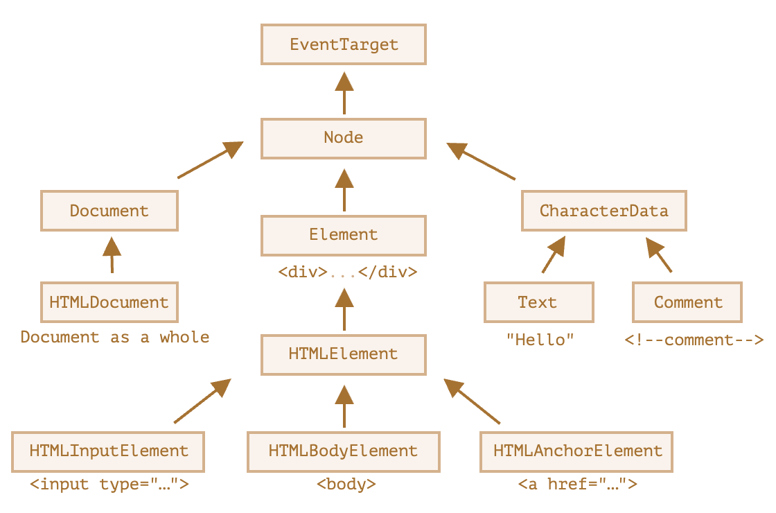 For example, the HTMLElement interface is the base interface for HTML elements, while the SVGElement interface is the basis for all SVG elements. Most functionality is specified further down the class hierarchy.