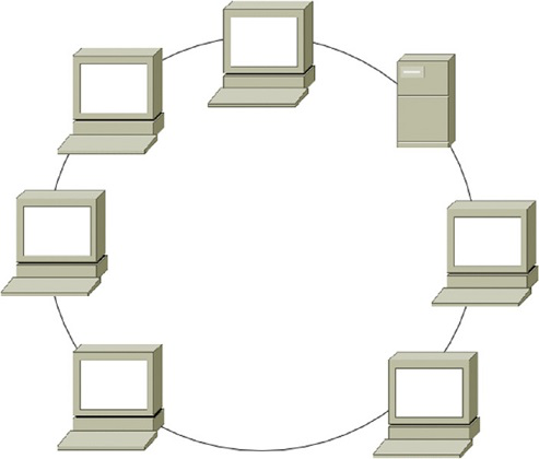 A. A ring connects all systems like points on a circle. A ring topology was used with Token Ring networks, and a token was passed between systems around the ring to allow each system to communicate. More modern networks may be described as a ring but are only physically a ring and not logically using a ring topology.