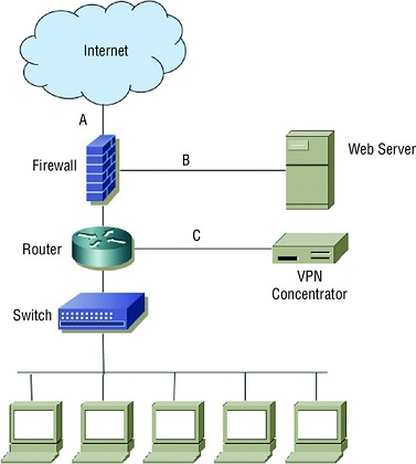 Chris is designing layered network security for his organization. Using the diagram below, answer questions 13 through 15.
