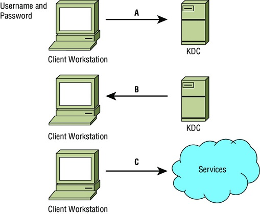 At point A in the diagram, the client sends the username and password to the KDC. How is the username and password protected?