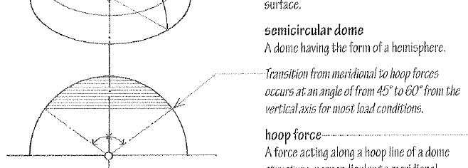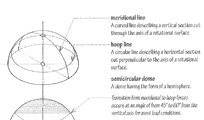 Transition from meridional to hoop forces occurs at an angle of from 45d to 60d from the vertical axis for most load condtitions.