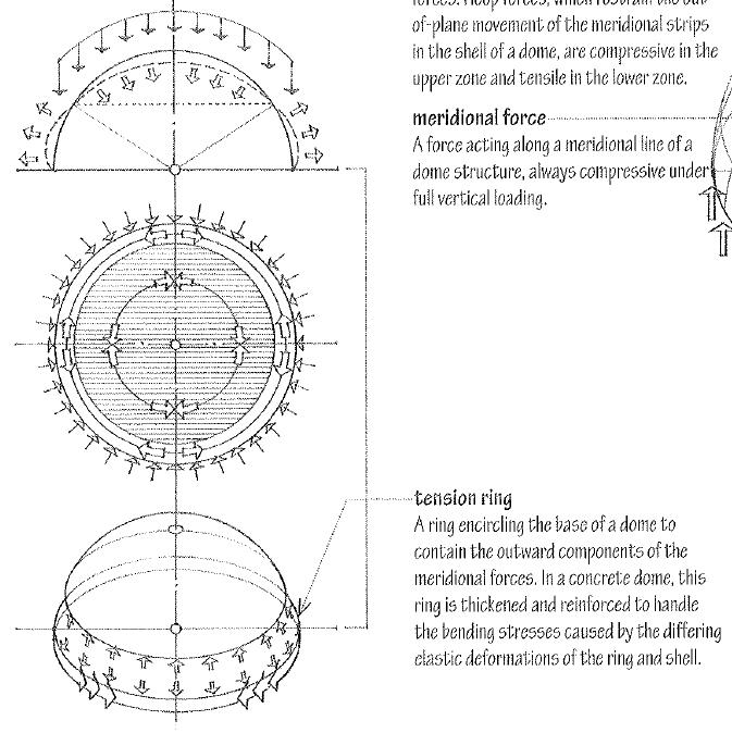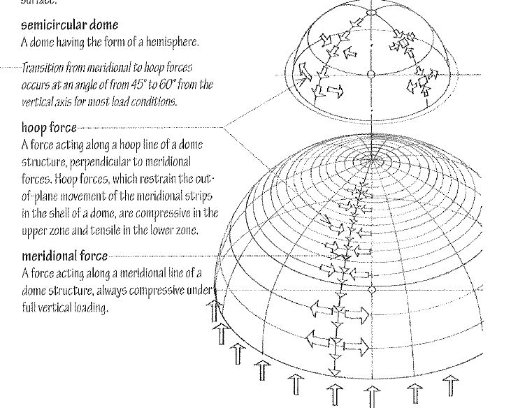 A force acting along a hoop lne of a dome strcuture, perpendicular to meridional forces. Hoop forces, which restrain the out-of-plane movement of the meridional strips in the shell of a dome, are compressive in the upper zone and tensile in the lower zone.