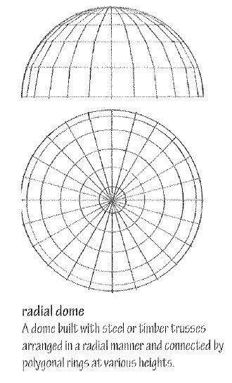 A dome built with steel or timber trusses arranged in a radial manner and connected by polygonal rings at various heights.