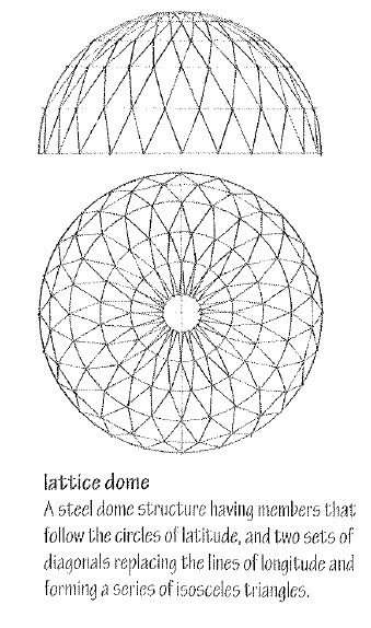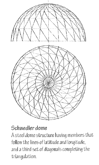 A steel dome structure having members that follow the circles of latitude, and two sets of diagonals replacing the lines of longitude and forming a series of isosceles triangles.