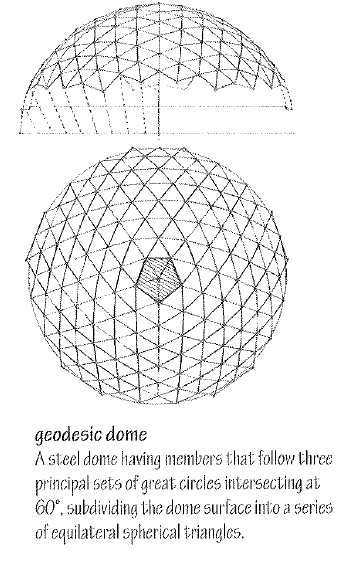 A steel dome having members that follow three principal sets of great circles intersecting at 60d, subdividing the dome surface into a series of equilateral spherical triangles.