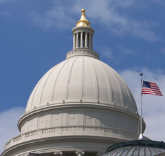 A steel dome structure having members that follow the lines of latitude and longitude, and a third set of diagonals completing the triangulation.