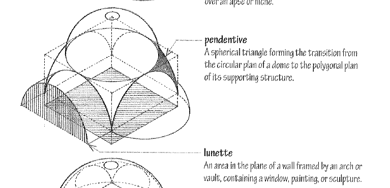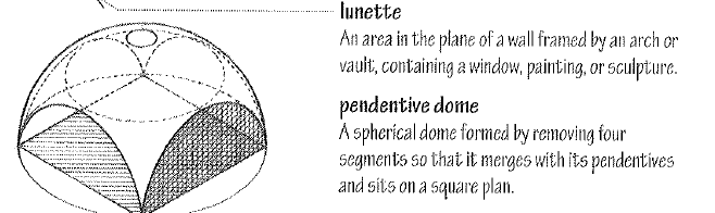 A spherical triangle forming the transition from the circular plan of a dome to the polygonal plan of its supporting structure.