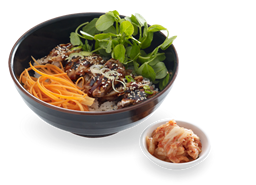 grilled chicken glazewd with teriyaki sauce, sticky withe rice, thinly sliced carrots, pea shoots and spring onions with yakitori sauce and sesame seeds. Served with a side of spicy kimchee