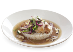 grilled chicken breast with stir-fried cougettes, mushrooms, red and spring onions in an oyster, ginger, garlic and wine sauce. Served on sticky white rice
